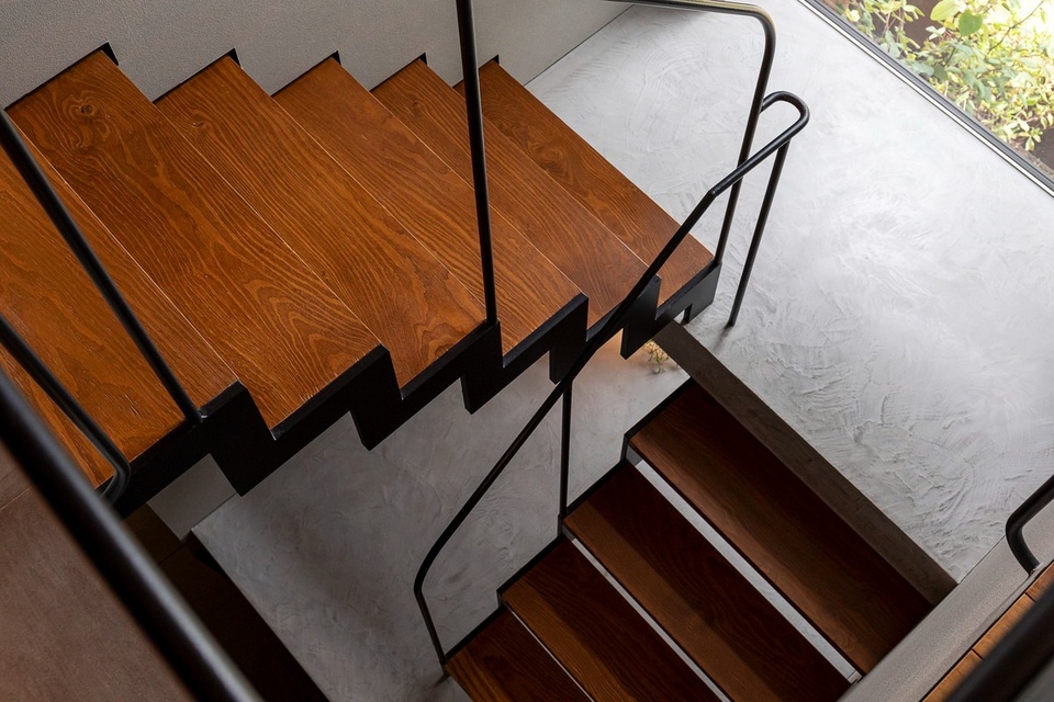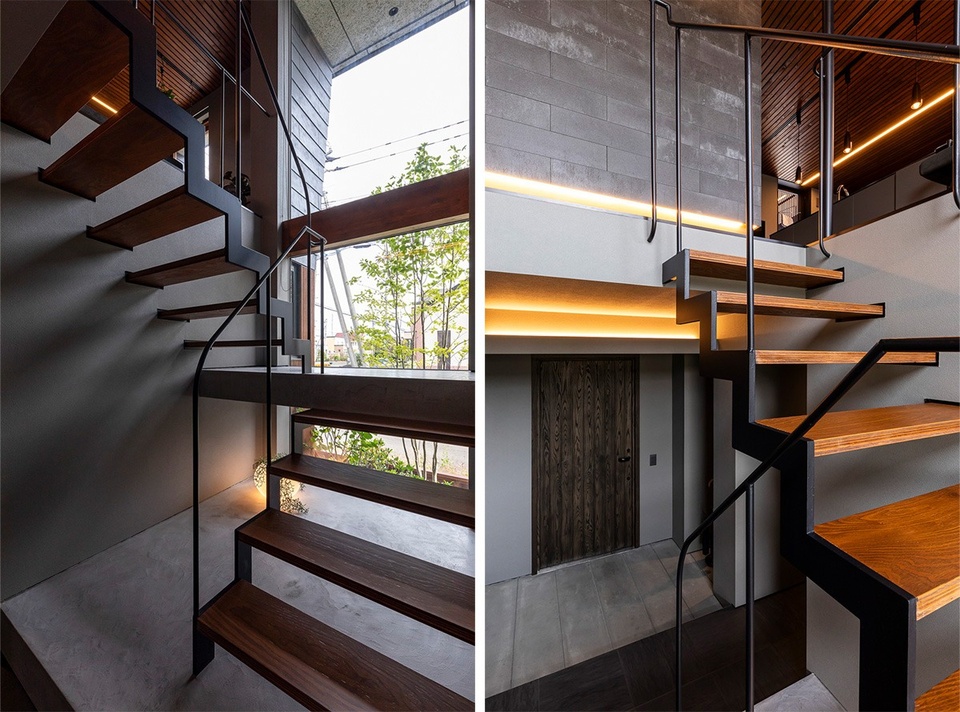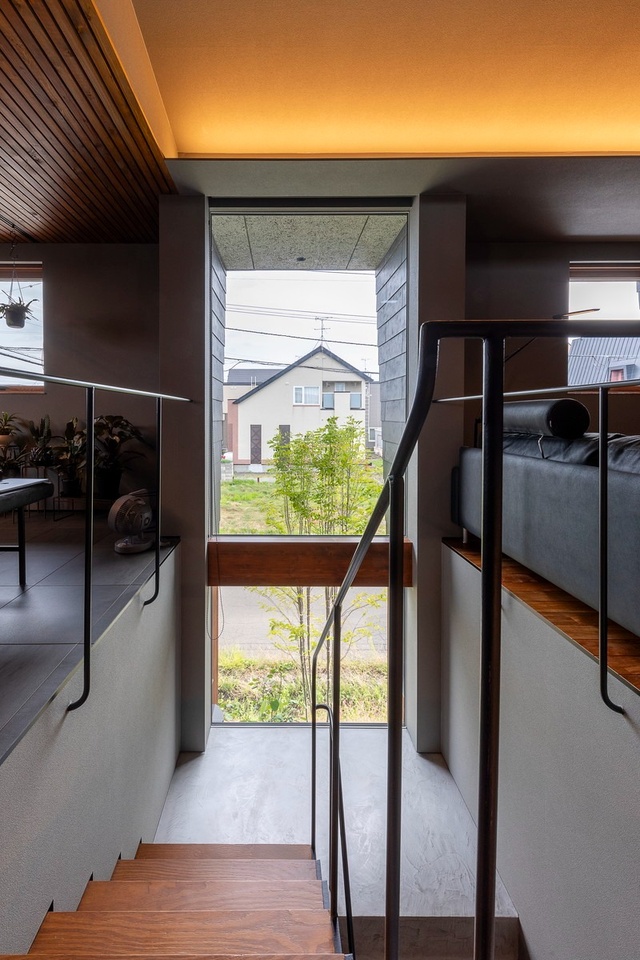 玄関ドアを開くと、正面に木製サッシの大開口部があります。スケルトン階段越しに光が差し込むスタイリッシュな空間です。