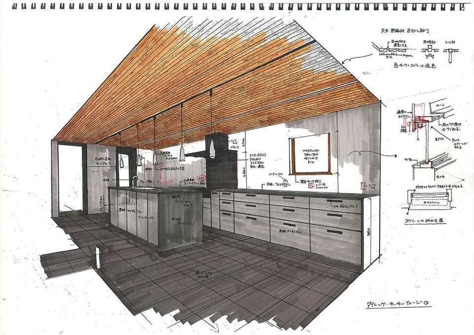 老川さん 最初に務めた会社で「手書きでパースが描けないと話にならない」と言われました。デジタル化が進んだ今の時代でも、私にとって、お客さまにイメージを掴んでいただく上で欠かせないテクニックです。