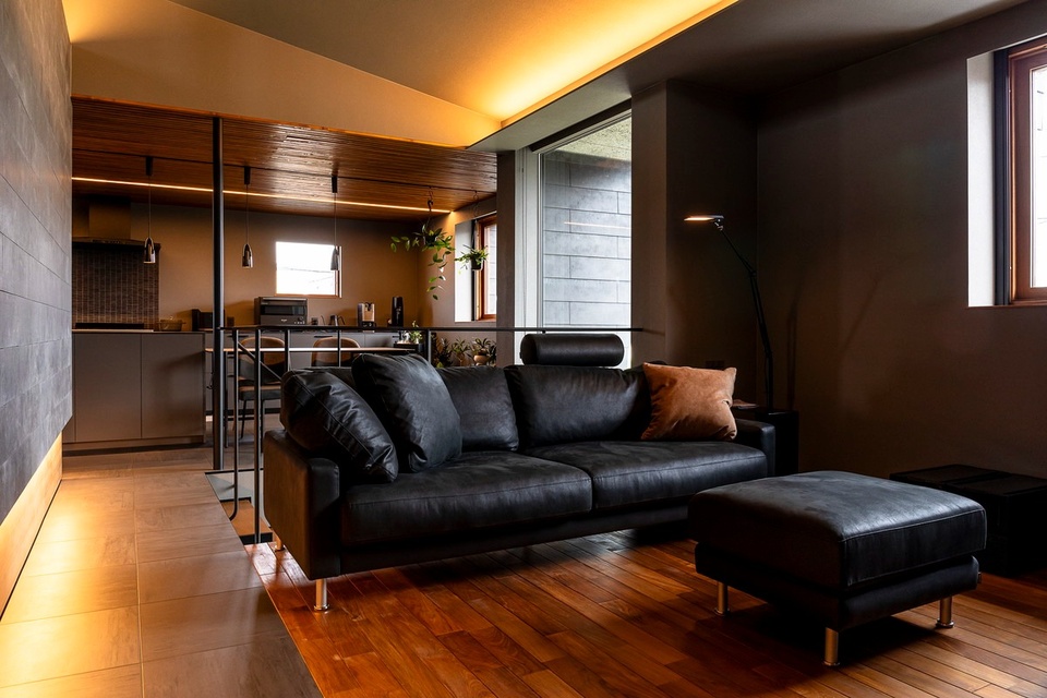 「高級感のあるカッコイイ家にしたかった」というSさんのこだわりを反映した勾配天井のリビング。