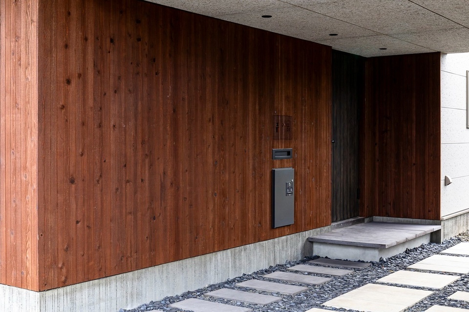 羽目板貼りのビルトインカーポートの奥に玄関があります。