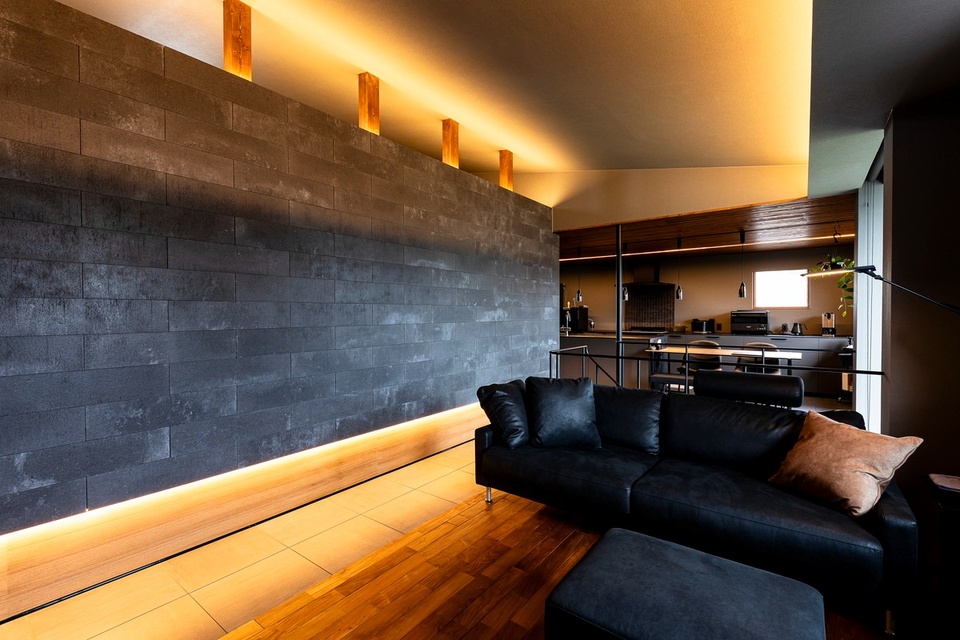 通路沿いの壁には、2階部分の外装にも使われているシングルスレート(SOLIDO)を貼り、間接照明をプラン。ラグジュアリーな空間に仕上がりました。