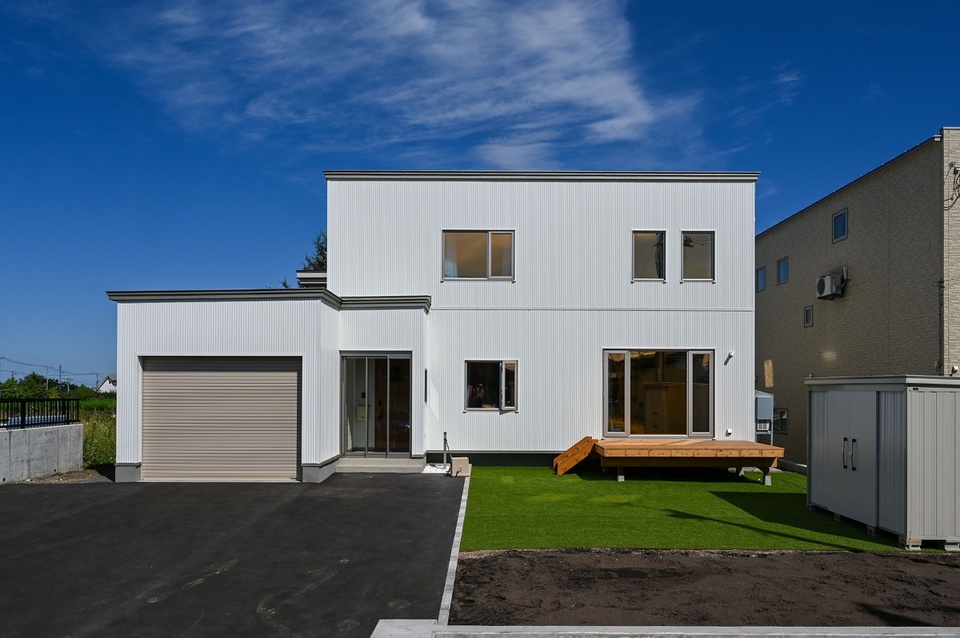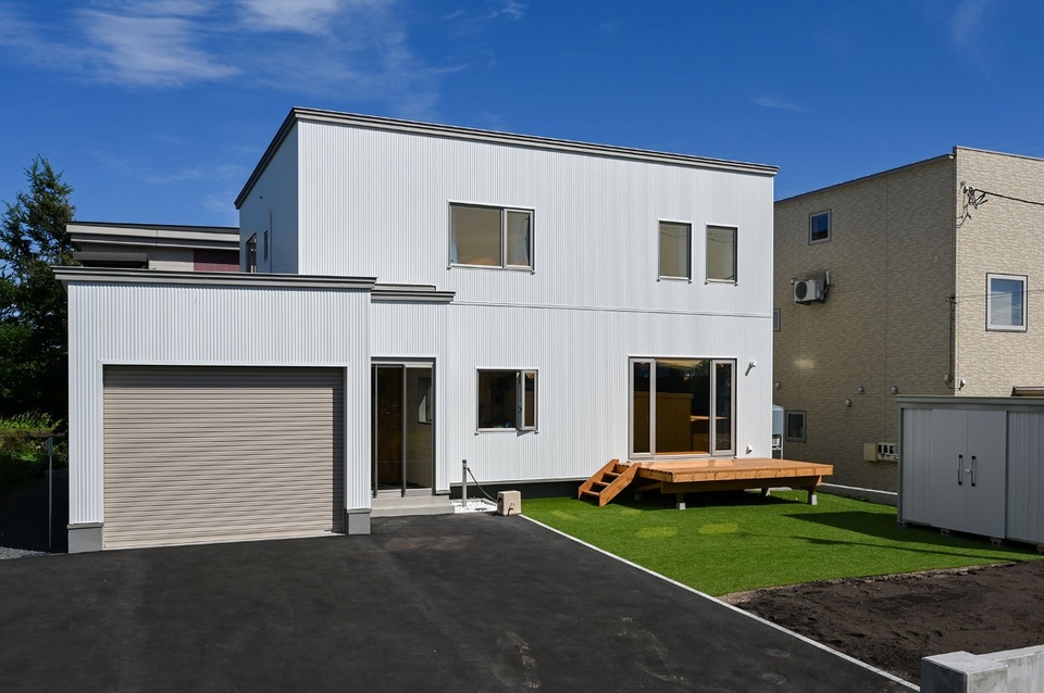 ガレージ一体の外観を見渡すと、金属サイディングの白が映える中に、サッシのプラチナステンカラー、シャッターのベージュがアクセントとなったカラーコーディネートが特徴的。屋根・破風・水切りの板金部分は、色をサッシのステンカラーに合わせています。「外装材・サッシ・シャッターの色が合うかどうか心配もありましたが、実際に完成してみたら一番しっくりきますね」とご主人。