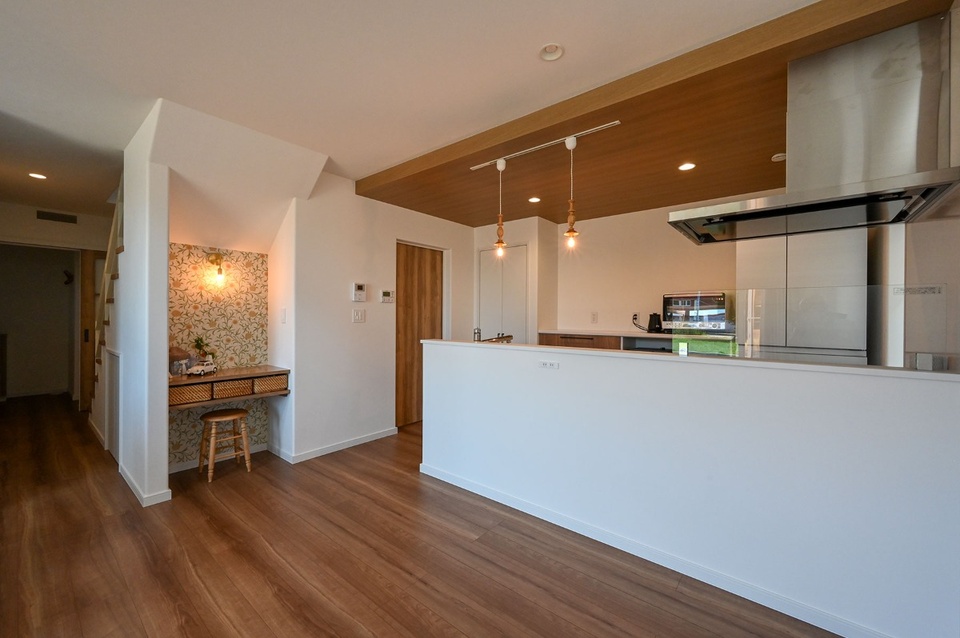家族のメイン空間となる約17帖の広さのLDKは、対面キッチンから吹抜けのリビング・ダイニングやお子さんの遊び場になっている洋室、そしてリビングから出入りできるウッドデッキの様子までよくわかり、ダイニング横の階段下スペースを利用してウィリアム・モリスのクロスが印象的な家事コーナーも設けられています。