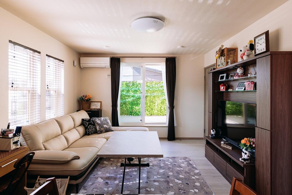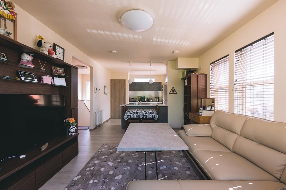 2階のリビングはルーフバルコニー付きです。「間取りはほぼ自分で考えたのですが、1階にガレージがあるのでLDKは自然と2階になりました。階段を上るのが大変では?という心配もありましたが、陽当たりがよく、カーテンを閉めなくても生活できる開放感があります」