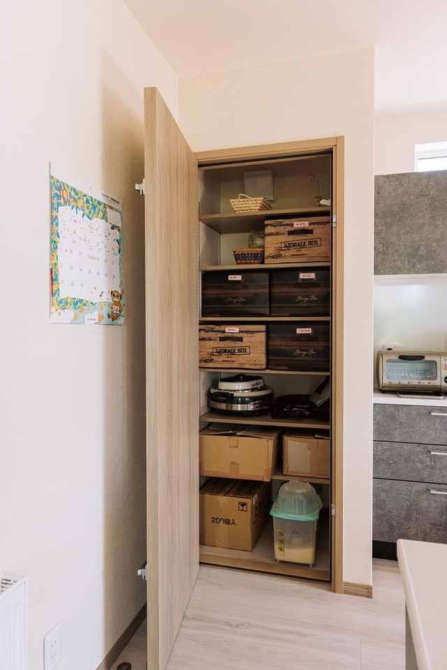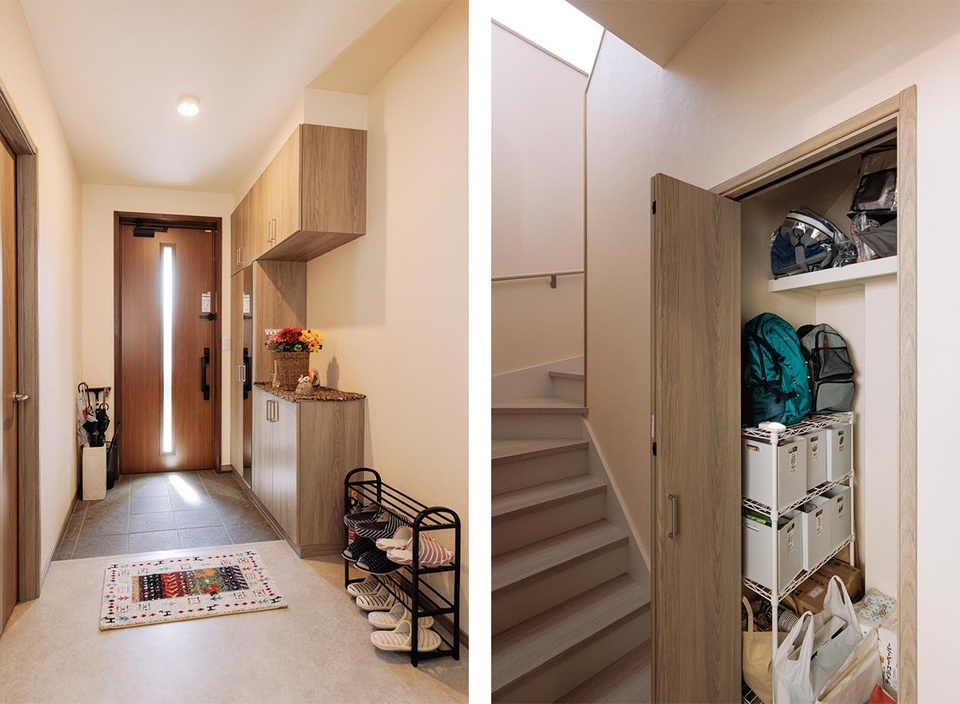 (写真右)階段下には防災グッズの収納スペースが。「住宅見学会を行う際には、サービスとして整理収納アドバイザーで防災士でもある徳本里栄さんの選んだ防災備蓄をプレゼントしています。決まった場所に分かりやすく収納されているので安心です」(赤坂社長)