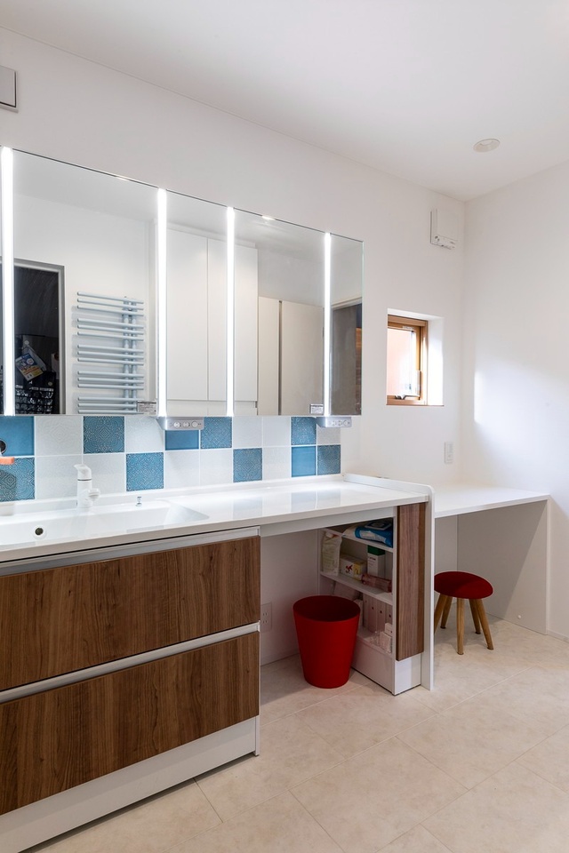 ワイドな洗面化粧台に加え、作業デスクも備えた洗面室。鏡下のタイルは数ある柄から好みの色やデザインを選びました。