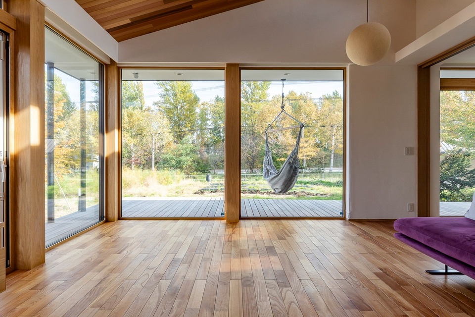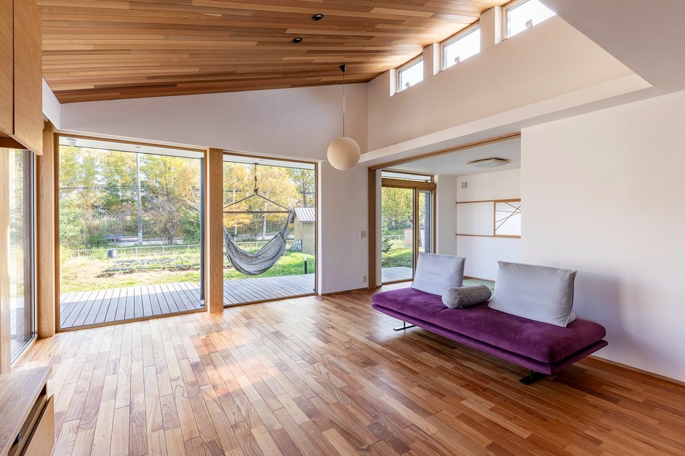 ご主人からは、外の景色が眺められるようガラス面を広くたくさん採りたいとの要望があり、ウッドデッキにつながる部分は全面ガラスにしました。まるで外と内がつながっているような開放感です。