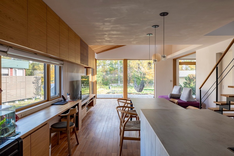 森の中での暮らしに憧れをもつご主人と、都市部で暮らしたい奥さまがそれぞれに納得できる土地を札幌市内で探すのに時間がかかりましたが、3年前にこの土地に出合い、2年かけて新居が完成しました。