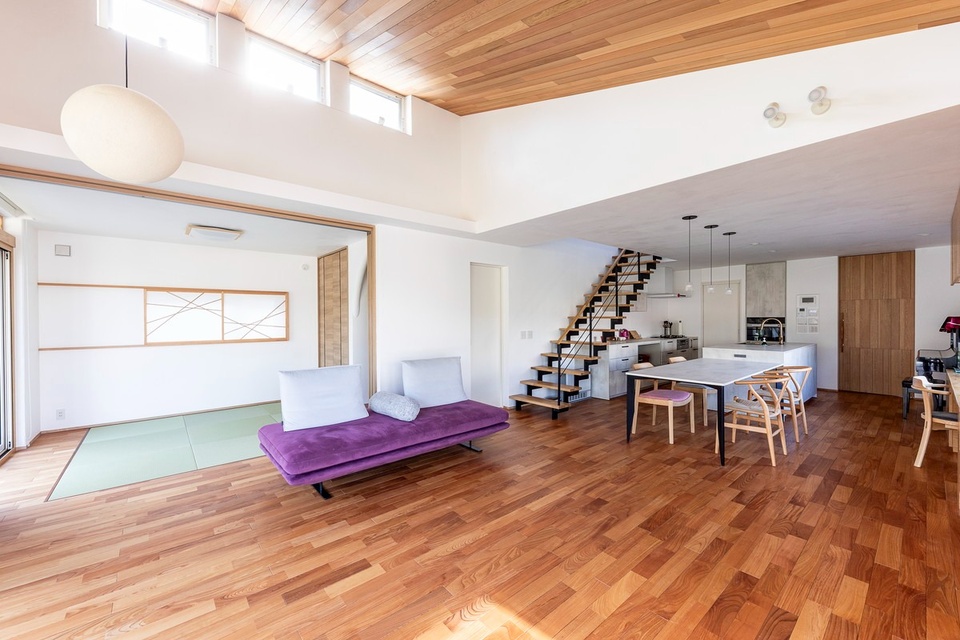 この家の中心はゆったりとしたLDKです。床材はご主人がこだわったというケヤキにしました。「とても丈夫な木材で、いろいろな色や模様が混ざっているので床の傷や汚れが目立ちにくいようです」と、奥さまも満足な様子です。