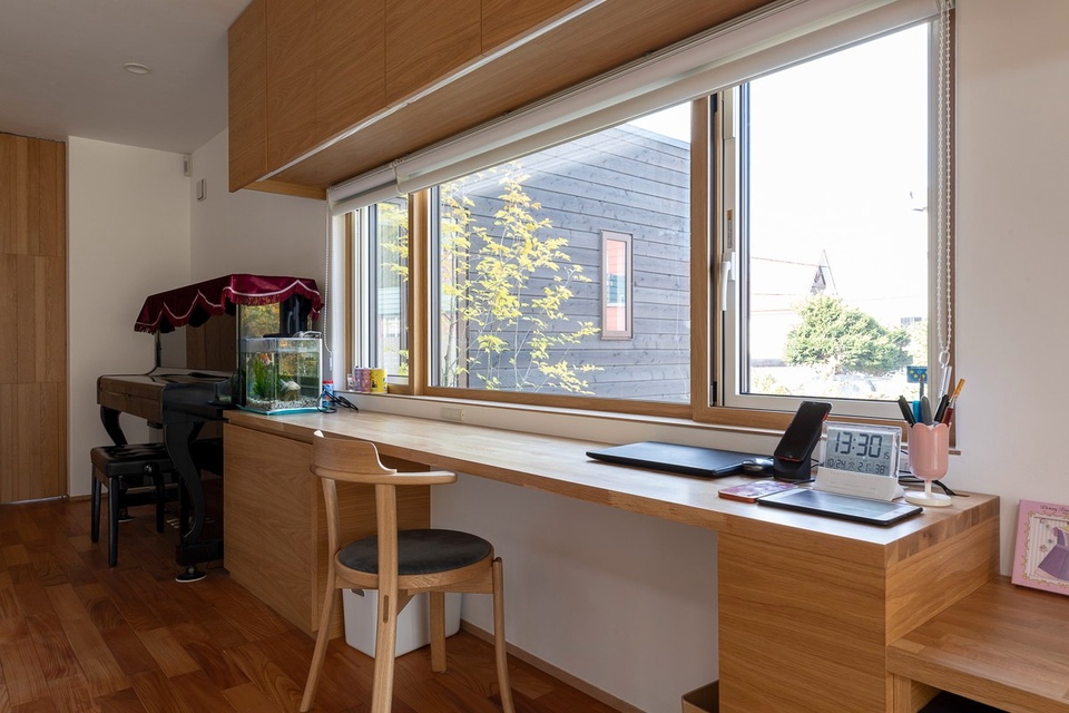 テレビの並びには娘さん用のスタディスペースを設けました。キッチンからも目が届きやすい場所です。
