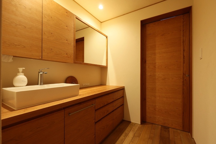 引き出しや扉収納の付いたオリジナルの洗面化粧台。ドアや建具なども造作しています。