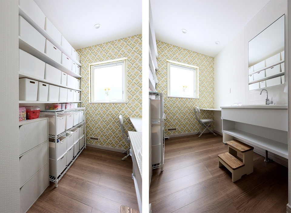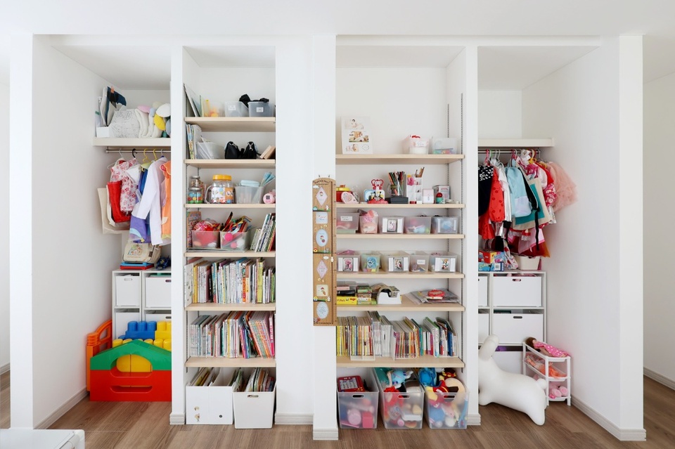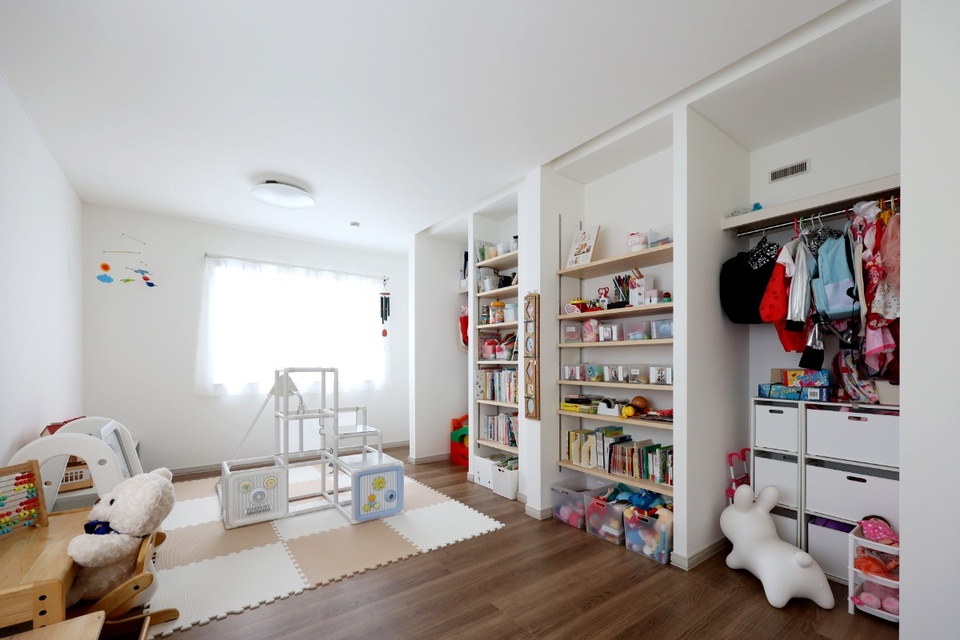 子ども部屋は奥さまの趣味で集めた絵本や知育玩具が、かわいらしく並べられています。娘さんたちもお気に入りの空間です。