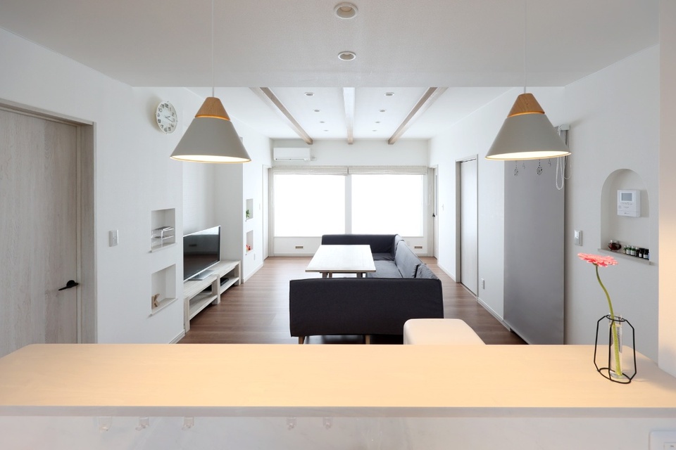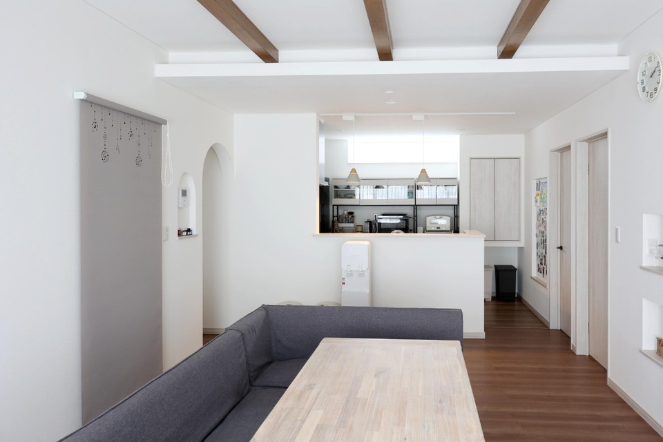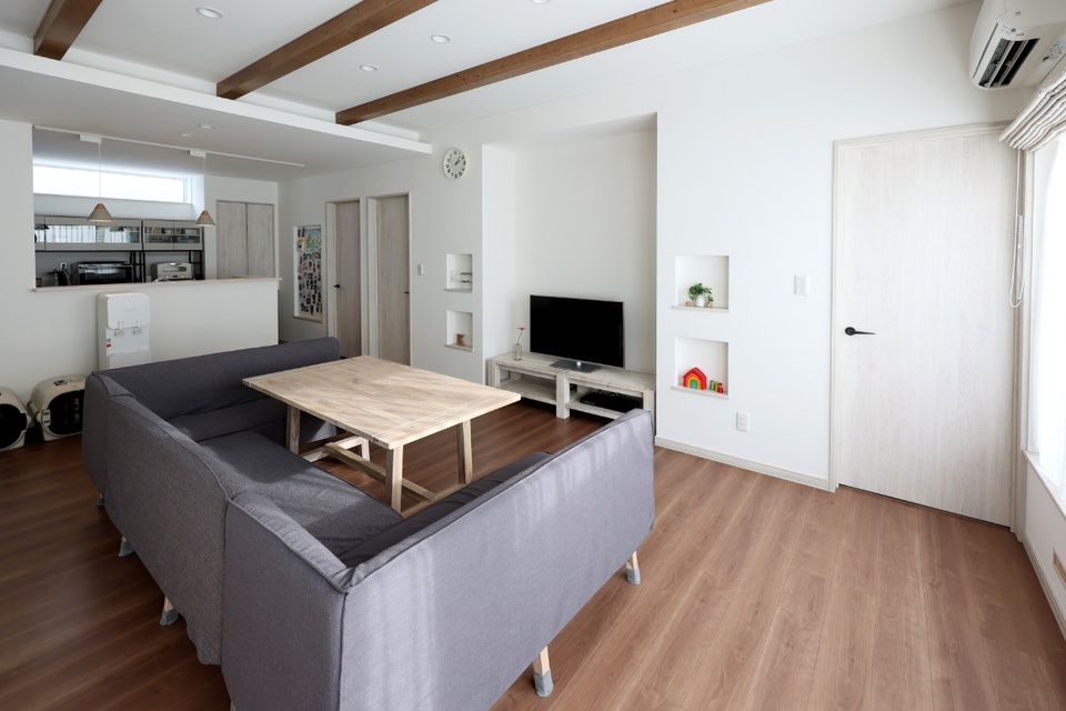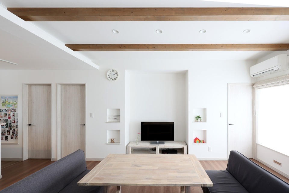 あらわしの梁やニッチなど、ていねいに施された職人技がLDKのアクセントに。テレビボードの背面側は子ども部屋です。