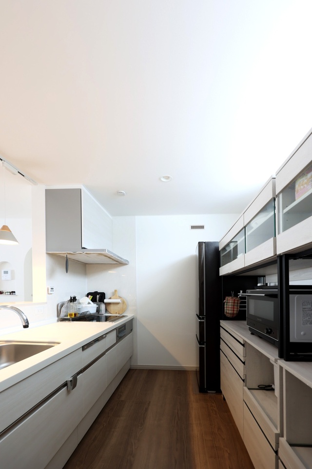 シンプルで使いやすいホワイトのキッチン。奥さまが見つけた背面収納は、造作家具のようにぴったりのサイズです。