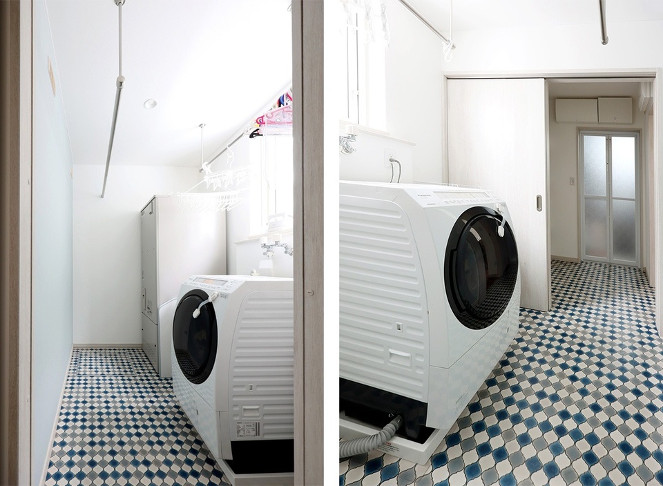 脱衣室・バスルームからまっすぐつながるランドリールーム。タイル調のフロアシートは奥さまのお気に入りです。長い物干し竿も完備しています。