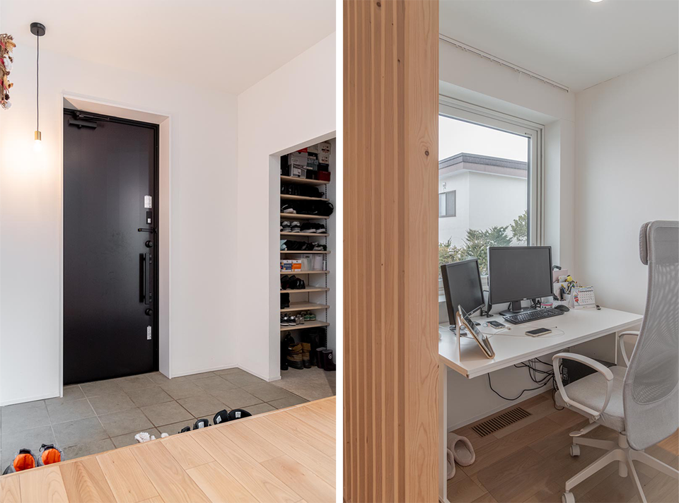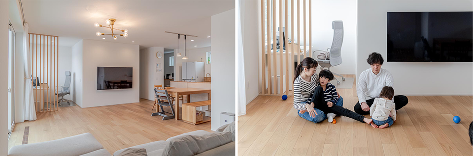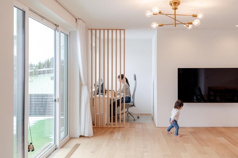 奥さまは仕事はほとんど自宅で行うというテレワーカー。完全な個室ではなくお子さんの様子を見守れるように、リビングの一角にデスクを置き、木のパーテーションで緩やかに仕切りました。