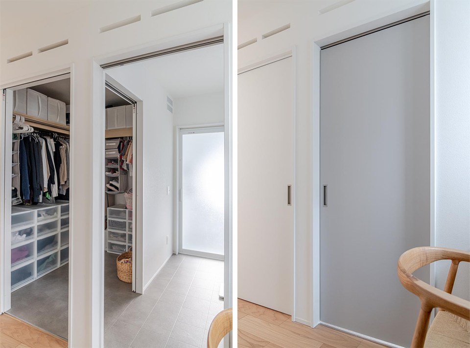 普段は洗面、脱衣所、クローゼットは扉を開放していますが、来客時は洗面エリアだけ空けるといった使い方ができます。洗濯機の近くに家族全員の衣類を収納するクローゼットを設けることで家事動線を短くしました。では、家づくりの経緯を伺います。