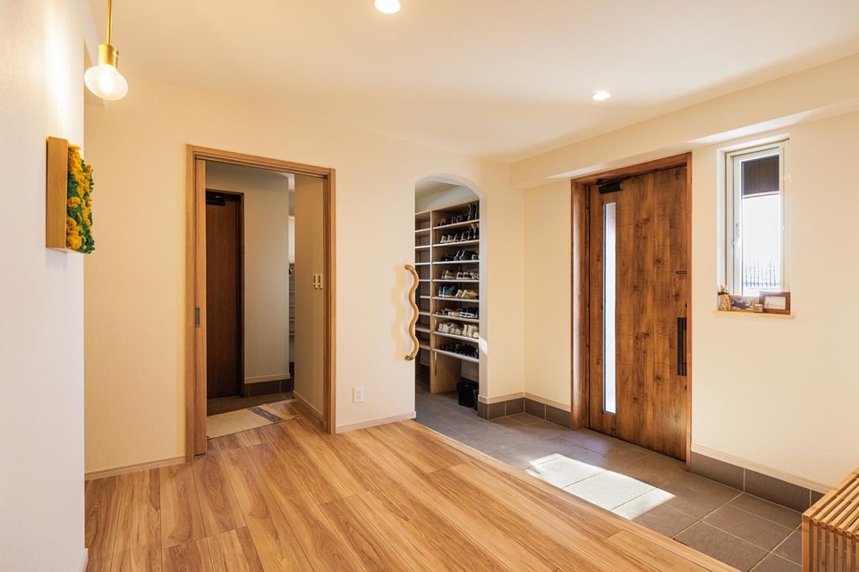 玄関は、農作業の際に使う勝手口(奥)と来客用の玄関(手前)をシューズクロークでつなぎました。上がり框を斜めにデザインし、空間の広がりを強調しています。