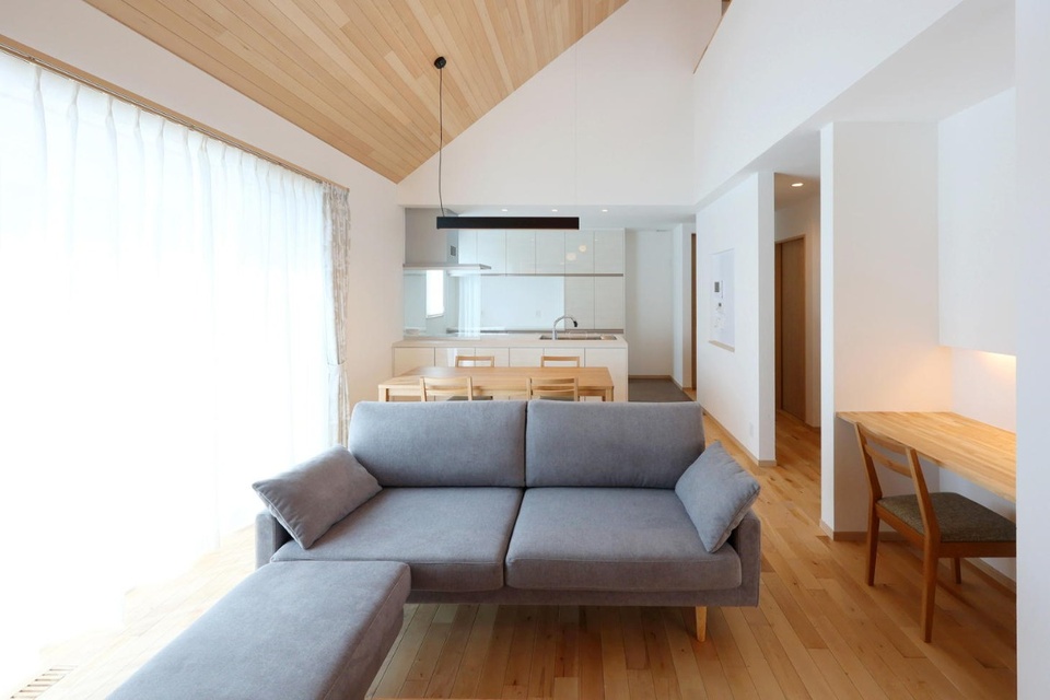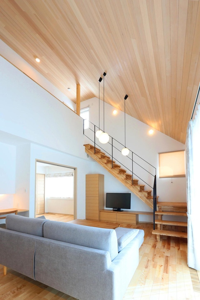 吹き抜け天井にはヘムロックの羽目板、壁には、ミネラル成分の入った粘土と白色珪藻土を採用。拓友建設らしい自然素材仕上げです。