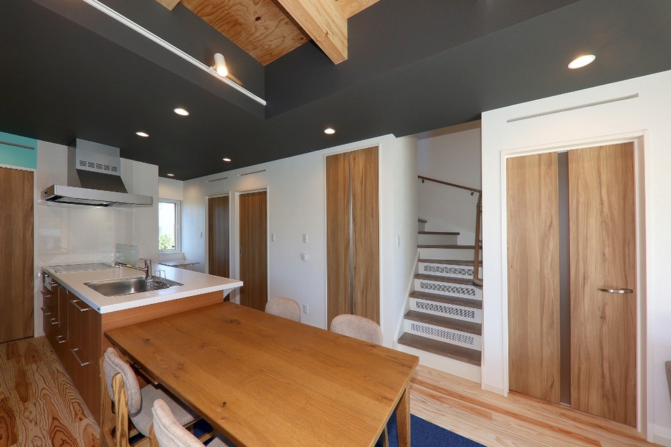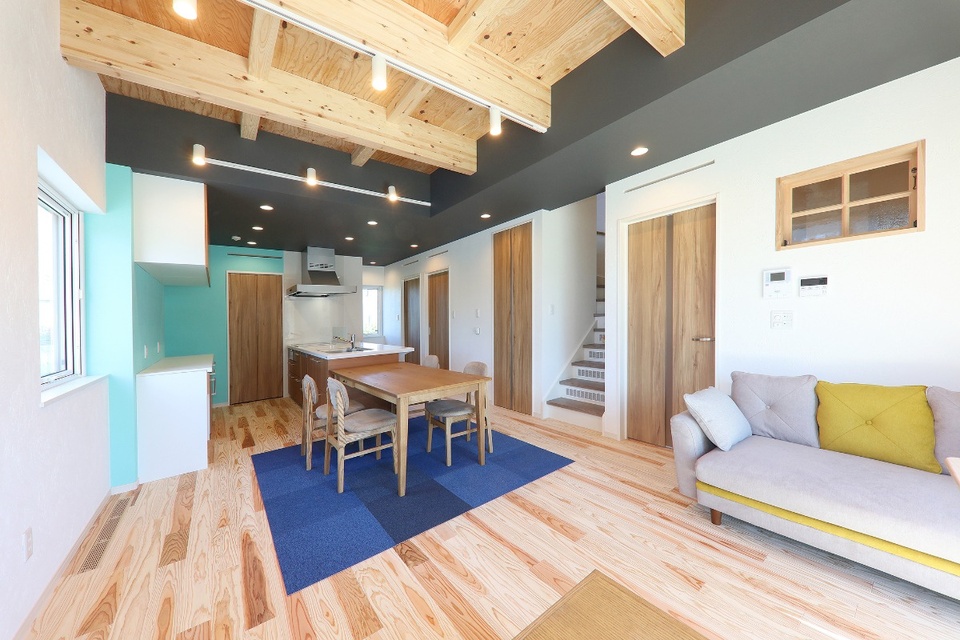 リビングは梁と2階の床下地合板を現しにした高天井。2.6mの高さがある開放的な空間です。床材には宮崎産のオビスギを使い、壁の一部は沖縄産のサンゴを材料にした塗り壁で仕上げています。