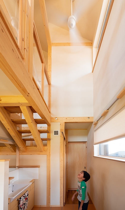 手洗いとトイレが並ぶホールの上には吹き抜け空間。ストーブで暖められた1階の暖気を2階に循環させる役割を果たす吹き抜け構造は、採光窓からの明るい日差しが差し込み、上下階でも家族がコミュニケーションを取りやすいなどのメリットもあります。