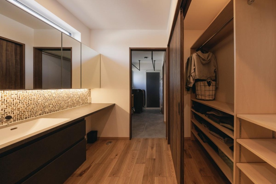家事のしやすさを左右する水回りの間取りは、裏玄関から洗面所、脱衣所、風呂場へと一直線に設計されています。帰宅後の身体を素早く清潔にできる動線は、子育て世帯にも参考になりそうです。