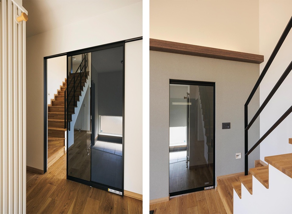 エントランスホールとLDKの間のドアはYKKAPのfamitto/G[ガラスタイプ]。グレーのガラスはシャープな印象を与えるだけでなく、玄関ホールの採光を確保し、リビングとの間で視線や音を適度に遮る効果も期待できます。