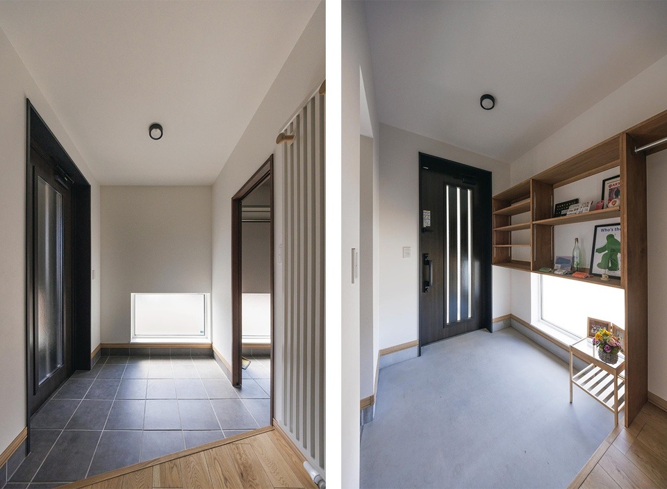農作業から帰る際に汚れが気にならないよう、表玄関(写真左)の他に裏玄関(写真右)を設計。それぞれ来客用、家族用と用途を分けています。