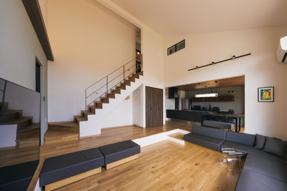 LDKには段差をつけたダウンフロアリビングを採用しました。キッチンとリビングの繋がりをもたせつつ空間をゆるやかに区切ったことで、リビングには家事を持ち込まず、ゆったりと過ごせる場所になっています。