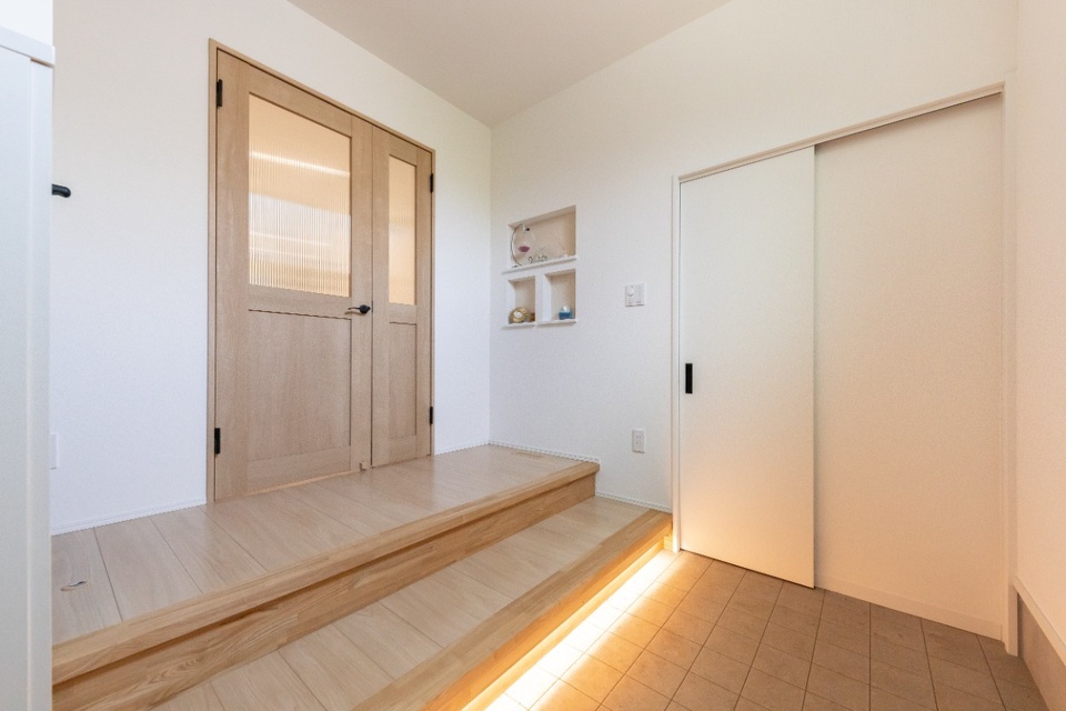 土間を照らす間接照明が印象的な広い玄関。2段式になった上がり框は白田さんの提案でつけられました。