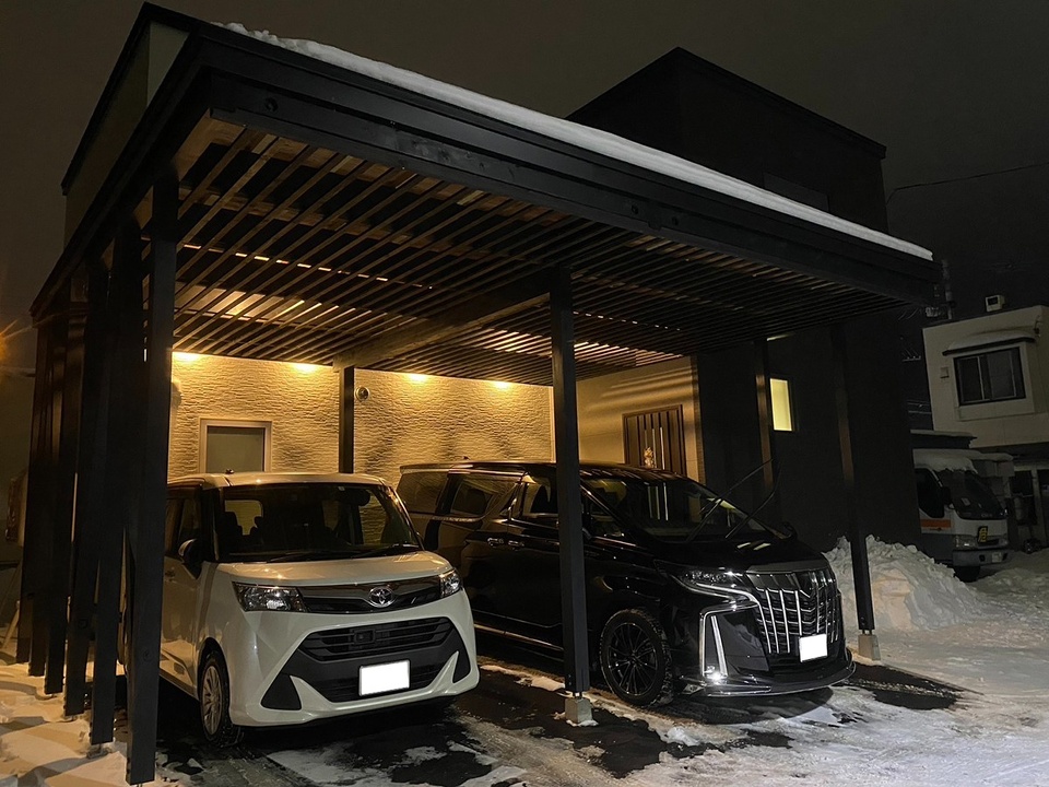 3色のサイディングで色分けされた外壁は、奥に明るいカラーを配置することで、立体的でスタイリッシュな印象になりました。夜はカーポートの屋根に設置されたライトが点灯して昼間とはまた違った雰囲気になります。