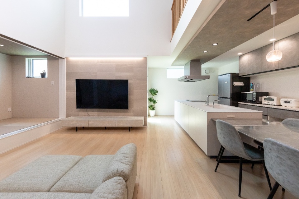 白い壁と明るい木目・吹き抜けで繋がる開放的な室内