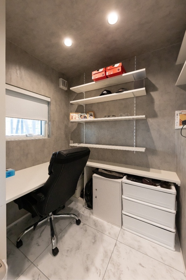 和室の隣にはご主人が兼ねてから希望していた書斎スペースがあります。「白とグレーを基調にして、カフェのようなイメージでクロスや床材を選びました」とご主人。