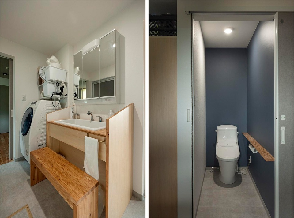 洗面台とベンチ、トイレのカウンターなど、家のあちこちにカラマツの造作が。
