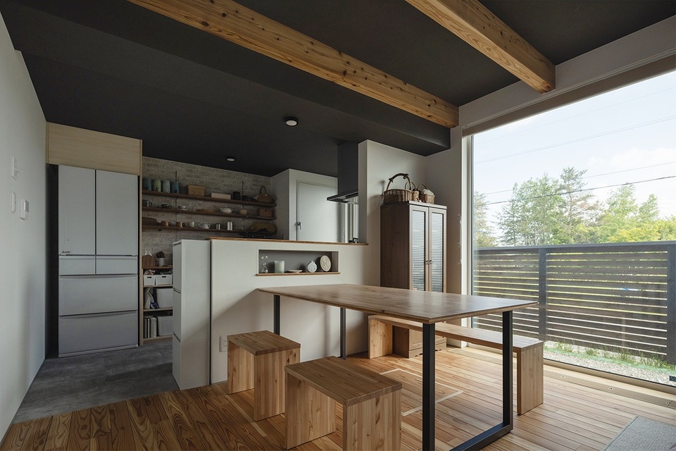 ダイニングテーブル、ベンチもカラマツで造作したもの。