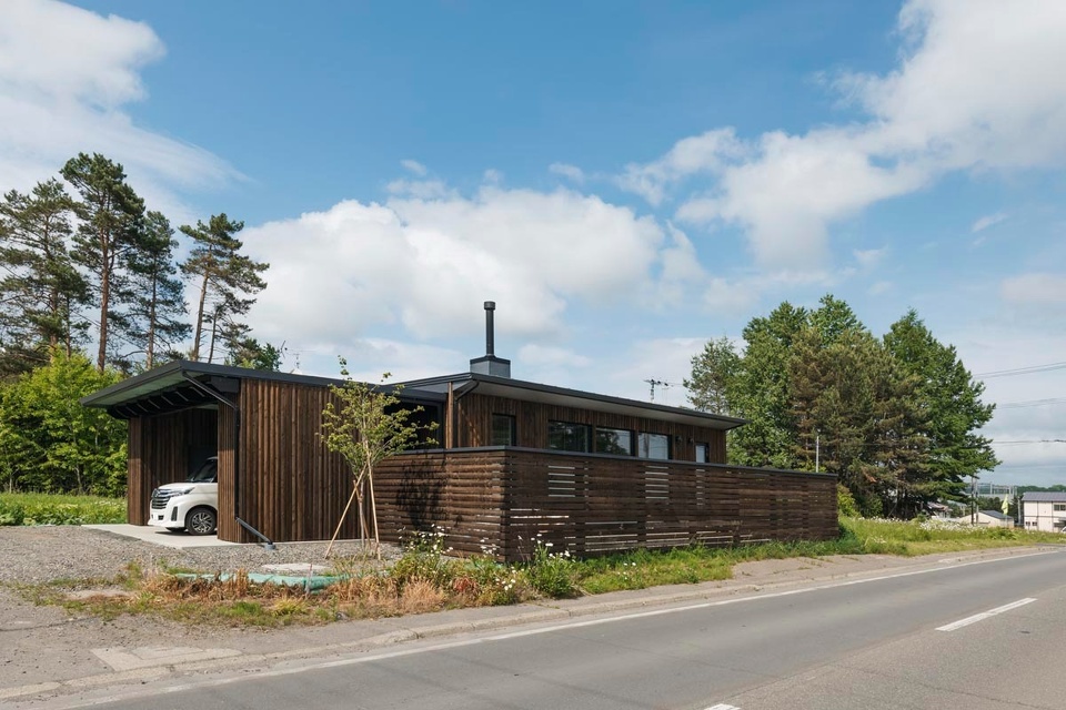 カーポートと物置も同じカラマツで製作しました。家の内側だけでなく外側にもなるべく既製品ではなく自然素材を使うことで、統一された素材感やデザインを実現しています。