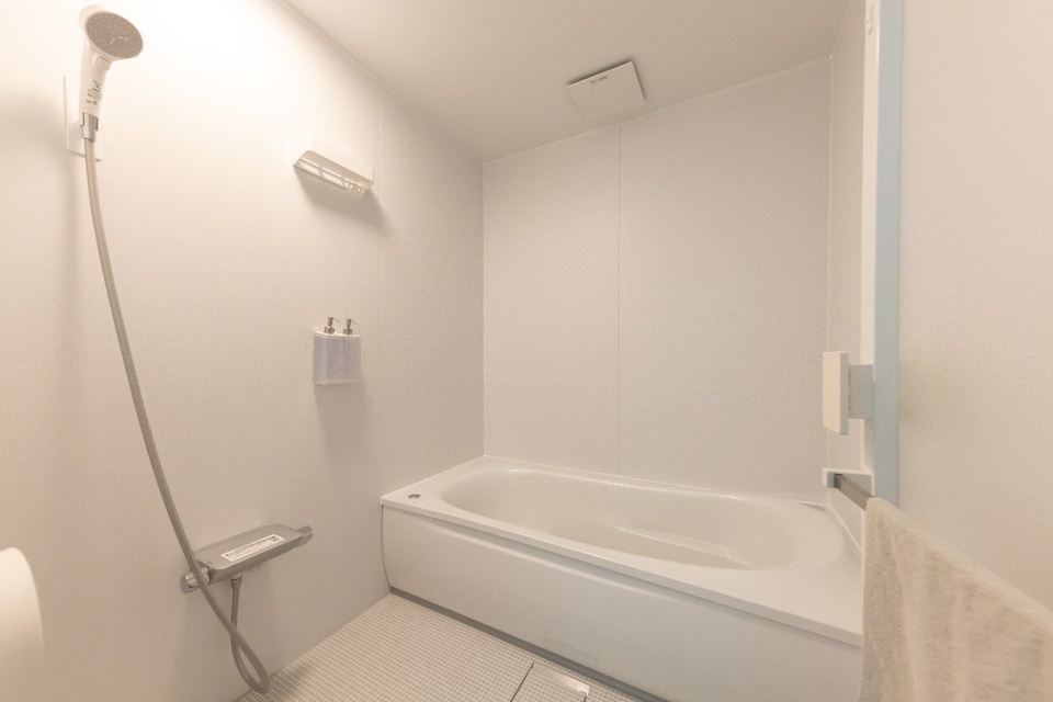 バスルームの壁はマグネットボードになっており、“浮かせる収納”が可能です。水垢が付きやすいので鏡は設置せず、脱衣所に鏡を取り付けました。