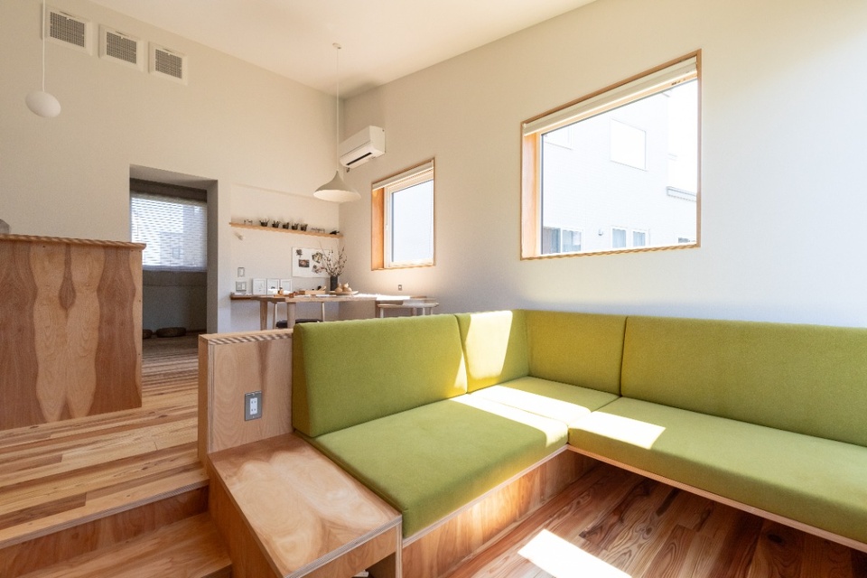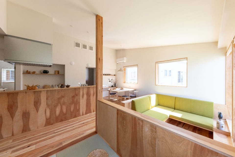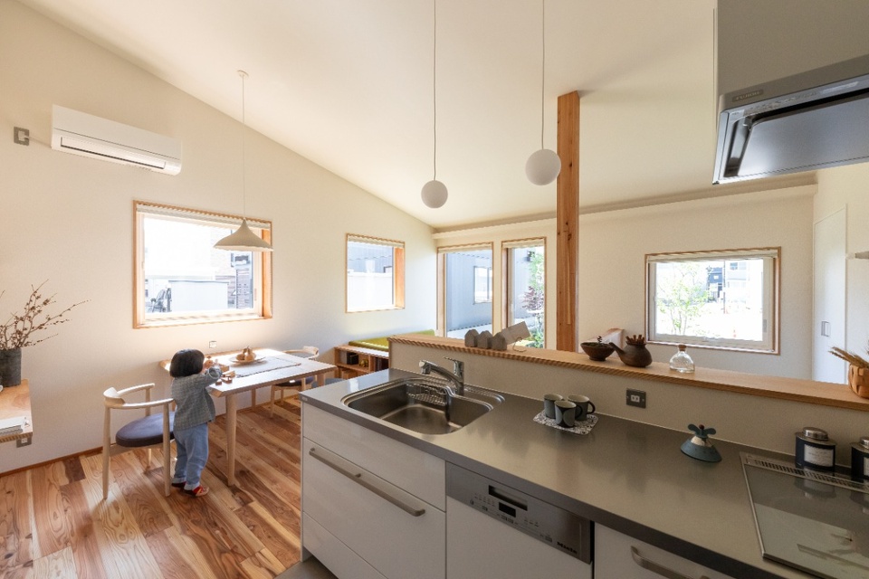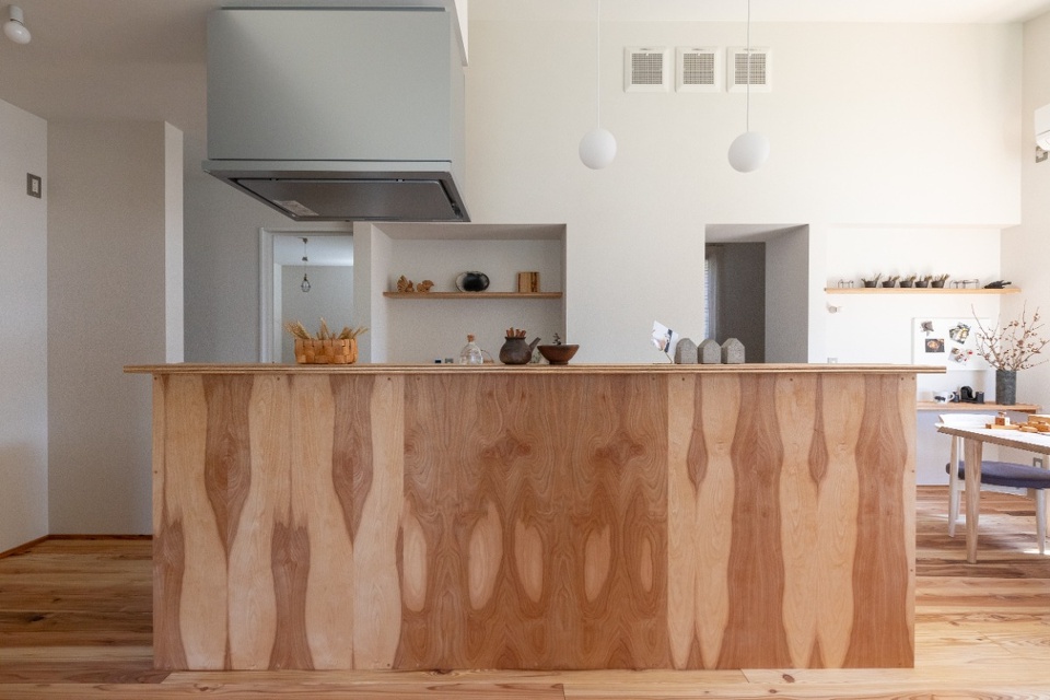 キッチンやタタミコーナーの腰壁は、道産シラカバ間伐材で作るエコシラ合板を採用。