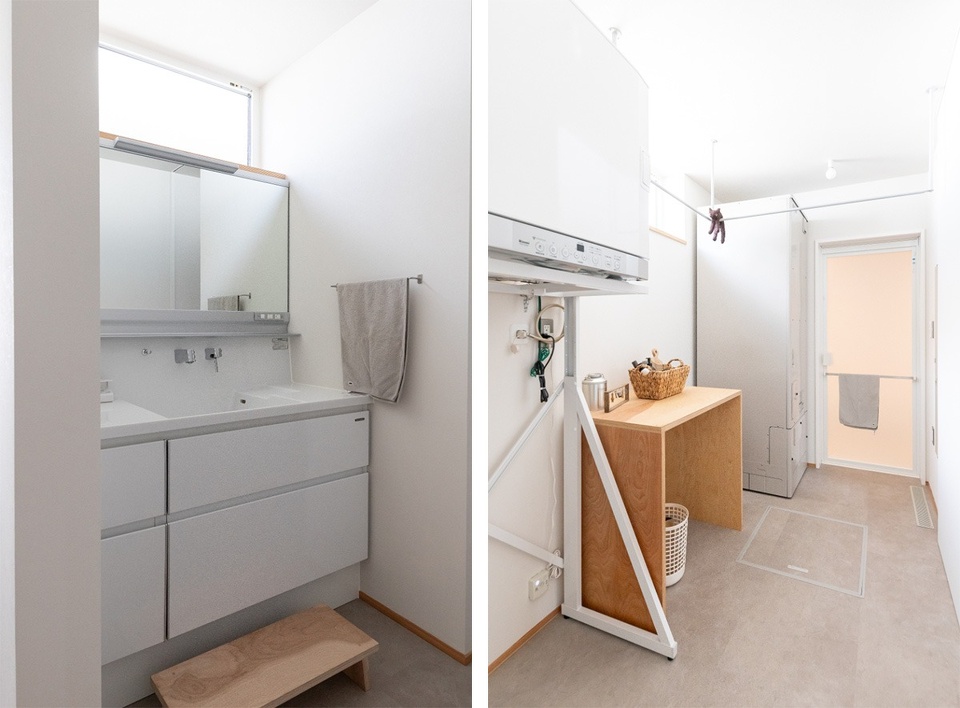 娘さんが洗面台を使えるように、子ども用の踏み台を造作。洗面所から続くユーティリティーには物干し用ポールを取り付けました。ポールにカーテンを下げれば、脱衣所として仕切れます。
