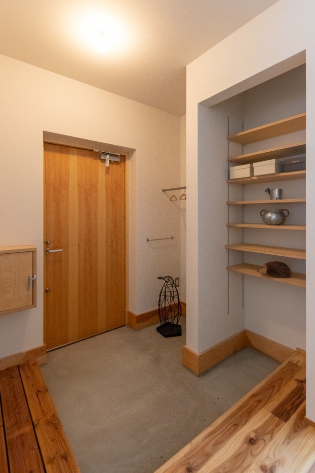 玄関を入ると斜め正面にキッチンがあり、買った食材を、すぐに冷蔵庫にしまえる距離感が魅力。玄関土間に造作したスノコのおかげで、宅配が届いた際も靴を履かずに玄関扉が開けられます。