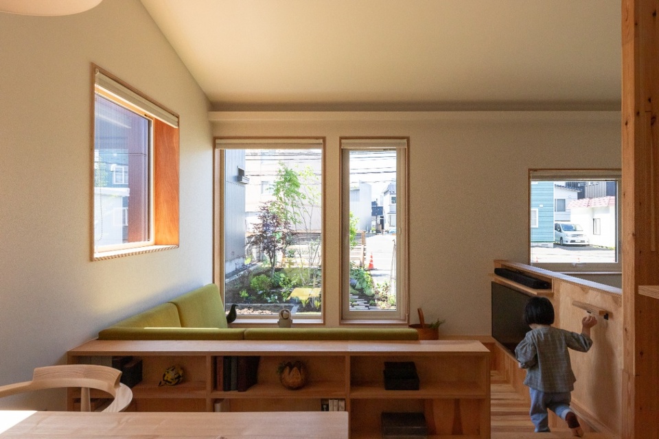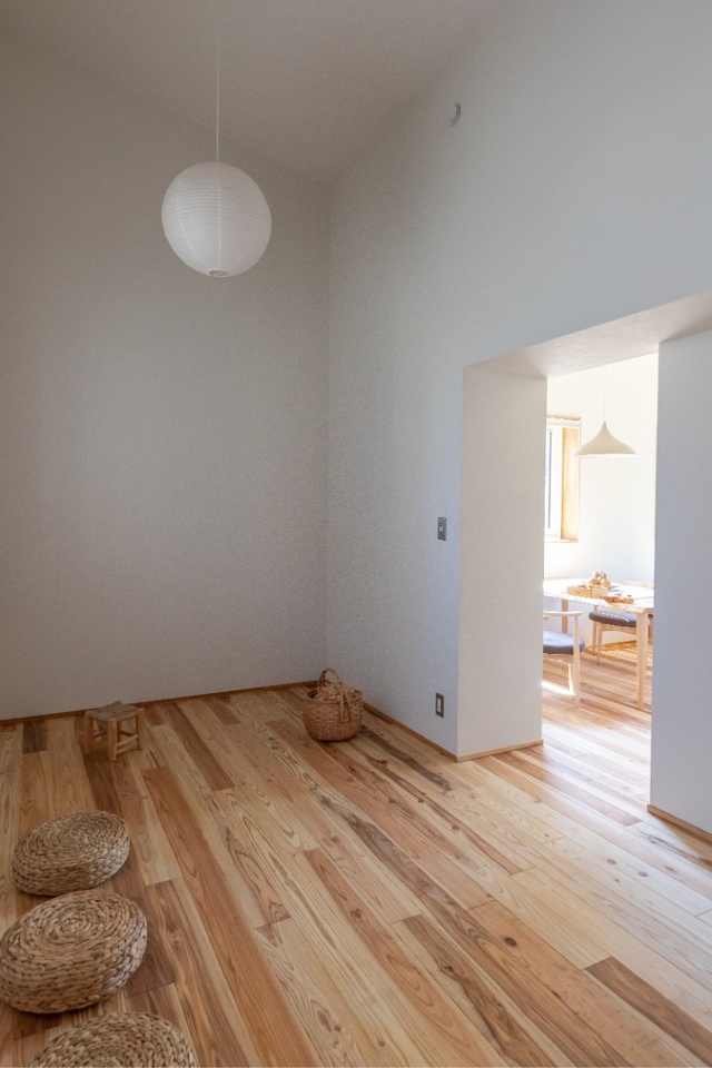 室内に入って驚くのは、延べ床面積が24.87坪とは感じられない空間の広がりです。秘密は、勾配天井が創り出す天井高と、ゆるやかに繋がるゾーニング、回遊式の間取りにあります。また、寝室や子ども部屋には造作棚やクローゼットを設けずに、将来的に部屋の用途を変えたり、ロフトを造ったり、部屋を分けられる“可能性”を残した設計にしました。