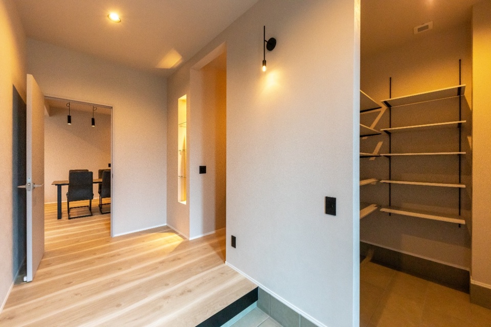 シューズクローゼットの付いた玄関。ホールの右手に洗面室、奥にLDKが見えます。