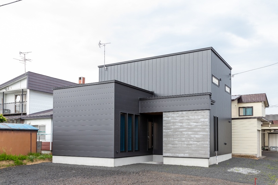 シャープでスタイリッシュな外観。外壁はテーマカラーのグレーを基調に、ガルバリウムとタイル調の窯業サイディングで仕上げています。