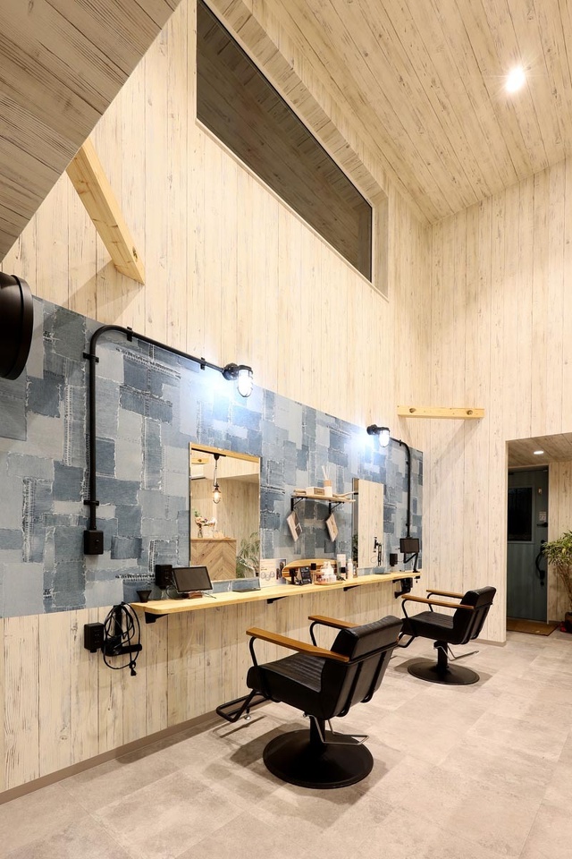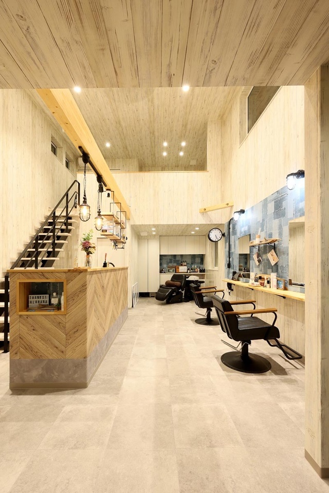 カラーやパーマの施術には、時間がかかります。居心地のよい空間で過ごしていただけるように、吹き抜けやエントランス側の大きな窓、内装のデザインなど、魅力的な店舗づくりにはこだわりました。
