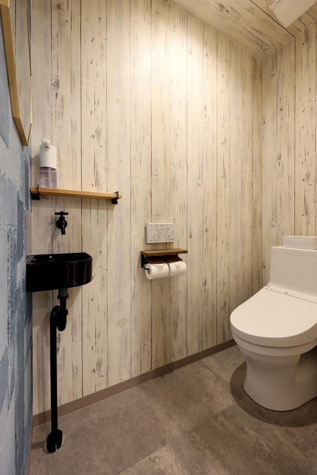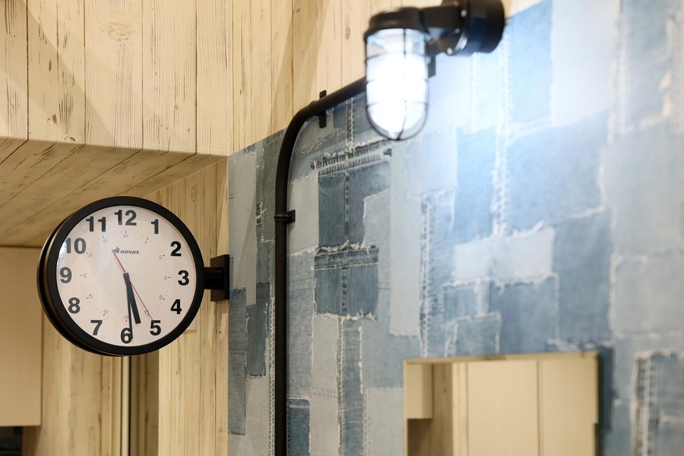 吉川さんが希望した内装イメージは「西海岸風テイスト」。また、お客さまが座る席のまわりにはインダストリアルデザインを感じさせるアイテムを置きたいと、生杉建設の担当者と相談してマリン灯や壁付けの時計を選びました。