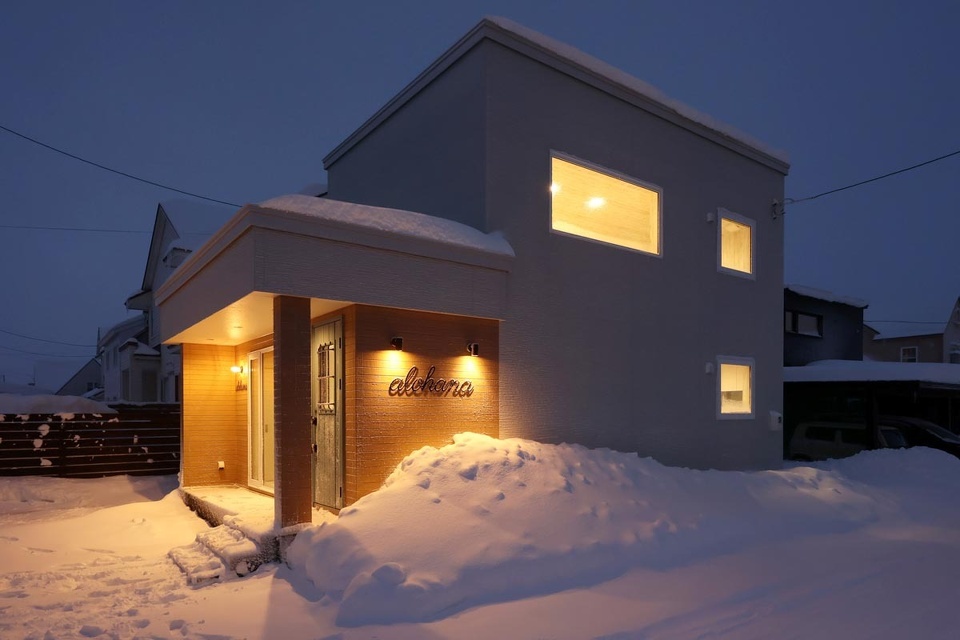 アンティークな玄関ドアと大きな窓。マリン灯の光が雪を照らす可愛らしいヘアサロン。2023年9月に完成した千歳市内の美容室「alohana hair works」を紹介します。