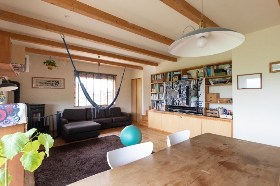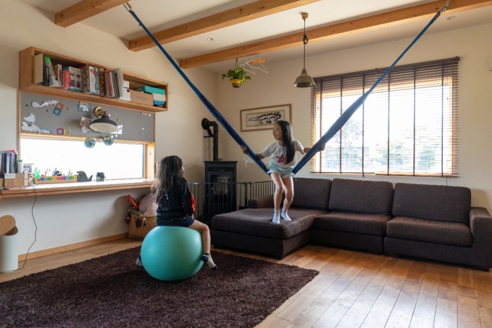 ハンモックをまるでブランコのように自由に操る小学生の娘さんと、バランスボールに座る幼稚園児の息子さん。一番上に中学生のお兄ちゃんがいる3人兄弟です。広々とした空間で子どもたちが元気に遊んでいます。