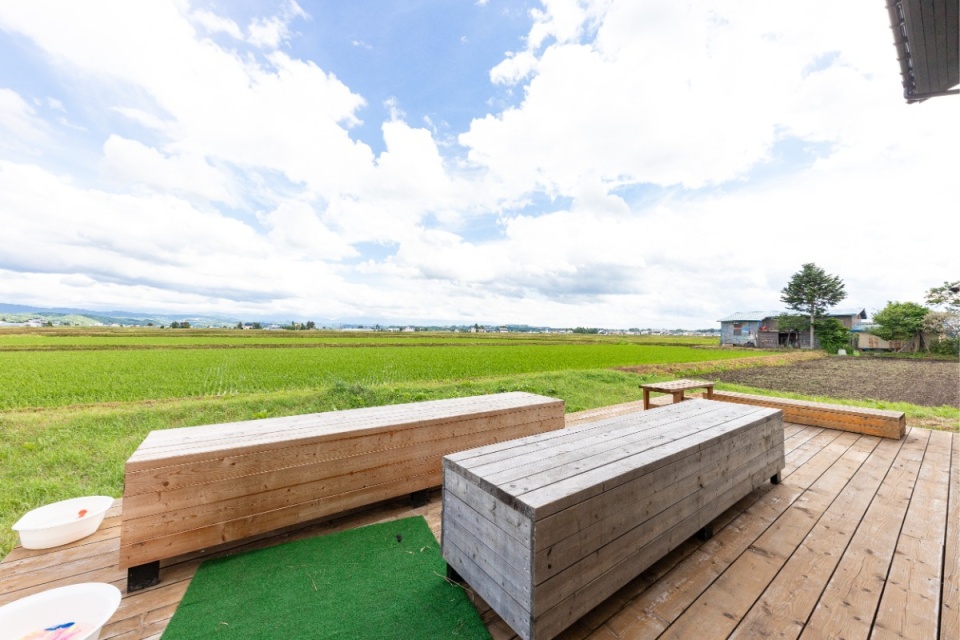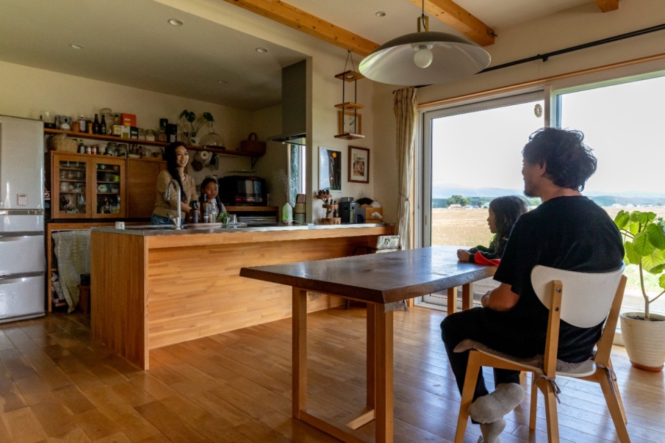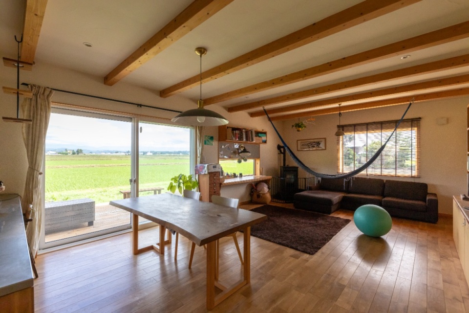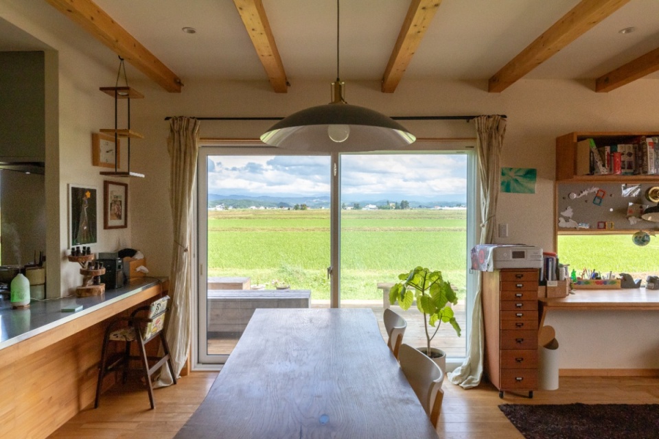 LDKに入って、一番に目に飛び込むのは、テラス窓からの眺めです。遠くに大雪山系を望む、どこまでも広がる緑の田園が続いています。