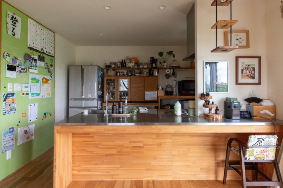 カウンター付きの対面キッチンは手入れがしやすいステンレストップにしています。