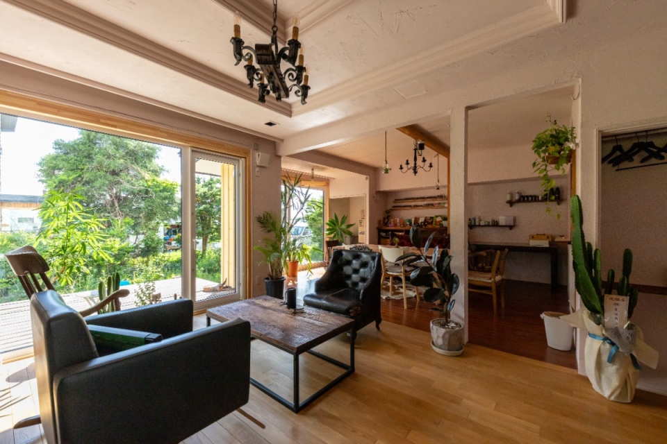 こちらはもともとLDKだった空間。現在は手前がヘアサロンの待合スペースに、その奥は、奥さまがアロマテラピーの講習などを行うテーブル・スペースになっています。